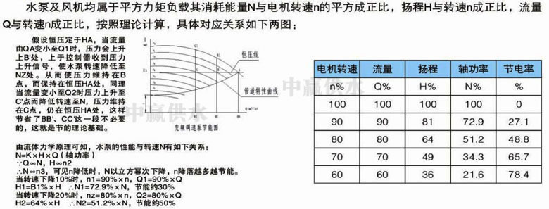 而HBW無負壓供水設備與自來水輸水管網直接串接,可以充分利用自來水管網原有的壓力;采用節能智能變頻控制技術,設備的電機泵在微機控制下,根據自來水的壓力來調節電機的轉速,只對自來水的進水壓力和所需壓力的差進行補壓,不做無用功,節能效果顯著,與傳統設計的采用常規繼電接觸器控制的給水設備相比,節電可達20%~60%以上。其節能分析如下: