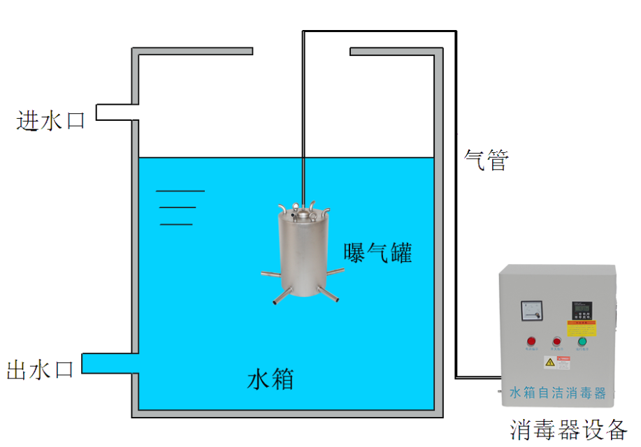 水箱自潔消毒器應放于水箱(池)底部,單臺放于中心,多臺均勻布置。將控制器安裝在干燥通風處,有防水、防雨措施。使水位超過二次供水潔水設備(內置)并于指定時間接通220V主電源使設備開始工作。